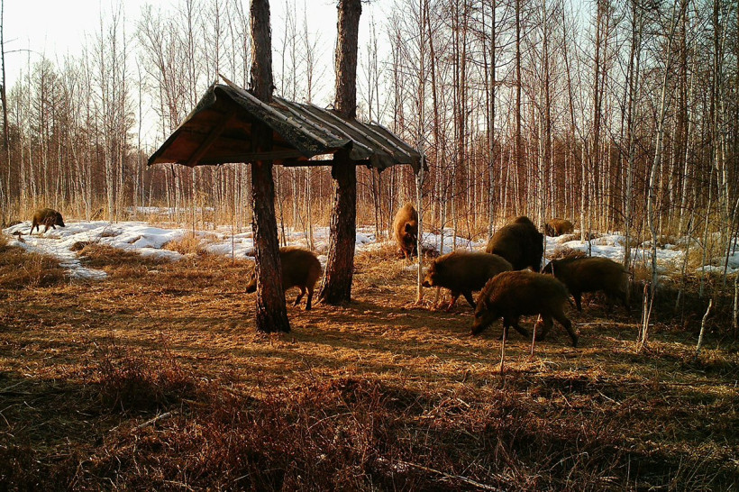 Копытные, в особенности кабаны, в еде непривередливы. Эта местность не соответствует ареалу кабана. Он мигрирует в южные районы, где есть дубняки и желуди. Последнее время вепри стали приспосабливаться к природным условиям Орловского заказника: едят сочную траву, копают корешки, разоряют муравейники и хатки ондатр. Не проходят и мимо лесных столовых, которые наполняют для них заботливые люди. «Последнее время здесь стало больше кабана, — замечает Сергей Павлович. — Не уходит на юг, остается. Наполнять кормушки мы начинаем только после того, как медведи залягут в спячку, — где-то с октября. Один раз мы сделали такую неосторожность — засыпали подкормочные площадки в сентября. А медведи как раз перед берлогой жир нагуливали. В этот период они едят все подряд: овес, ячмень, да еще с кабанами на пару. Медведи нам такого шороху навели: все разворотили, крыши у кормушек посрывали, корыта укатили в лес.
