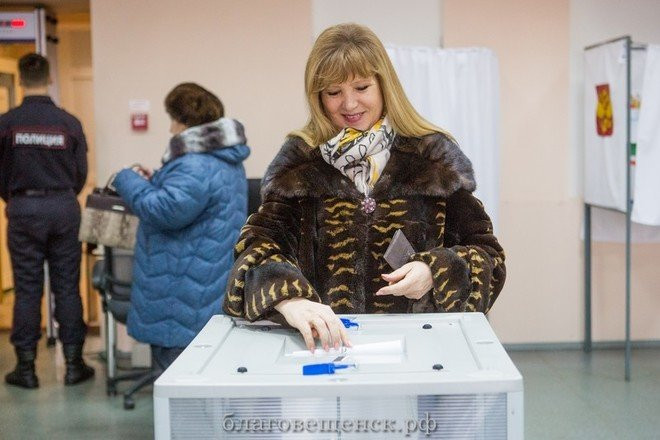 «Для нас, женщин, это особая роль, поскольку мы всего 100 лет допущены к голосованию», — отметила мэр Благовещенска Валентина Калита. Градоначальник отдала свой голос за президента в областной столице.