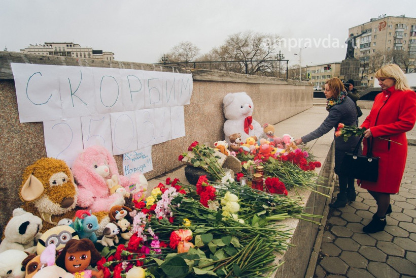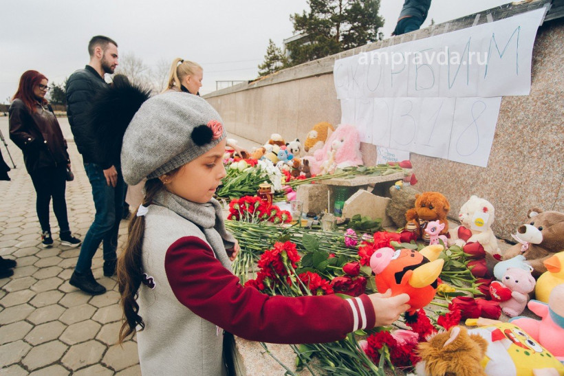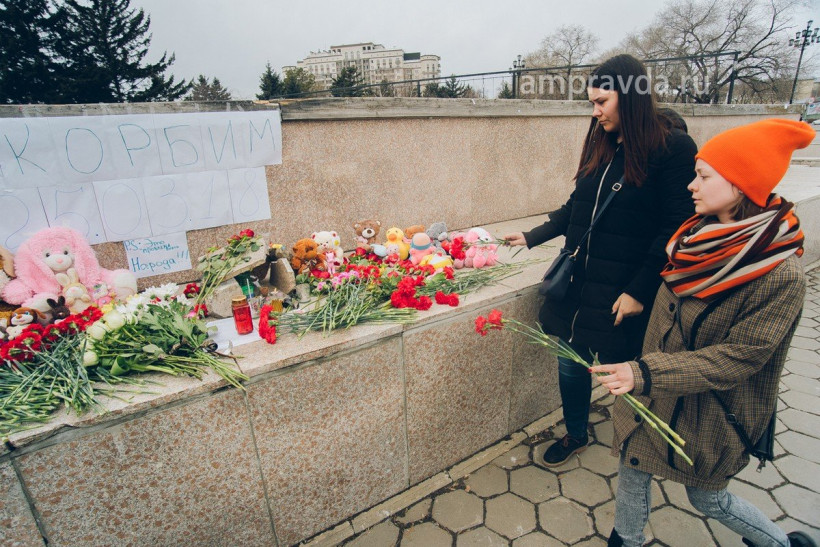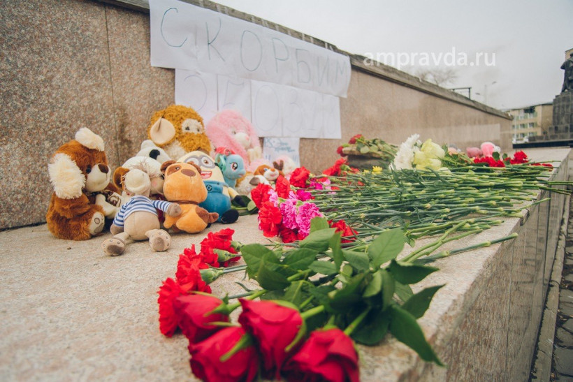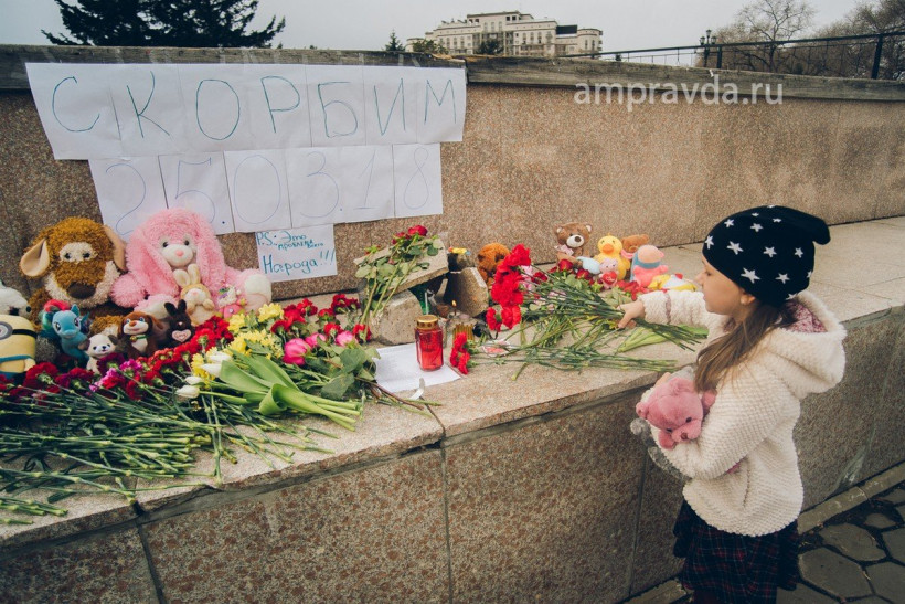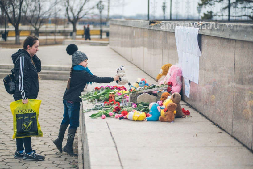 Стихийный мемориал в память о погибших при пожаре в Кемерове организовали в Благовещенке. Взрослые и дети, старики и молодежь — десятки горожан приносят на площадь Ленина цветы, игрушки и зажигают свечи скорби.