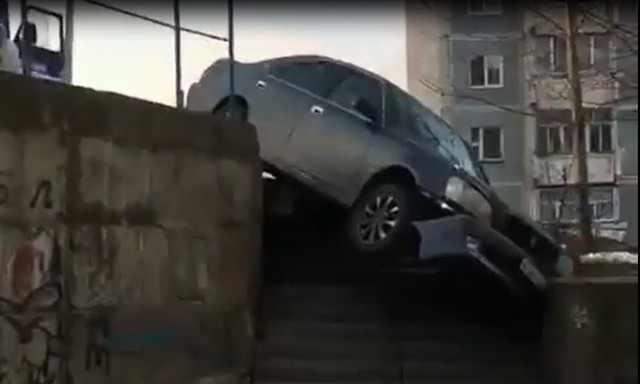Пьяный водитель влетел в парапет в центре Тынды и застрял на лестнице