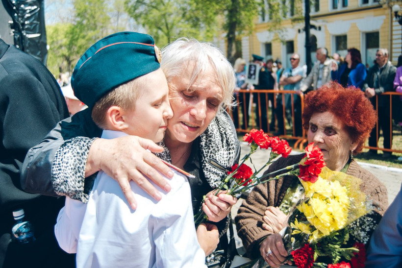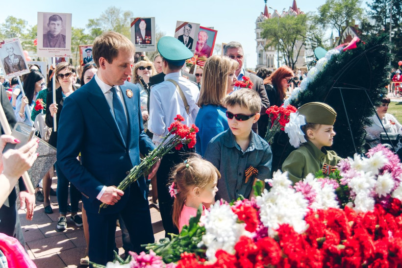 Рекордное количество человек — 17 200 — прошагали 9 мая в «Бессмертном полку» в амурской столице. Шесть колонн выдвинулись от Общественно-культурного центра ровно в 11:30 и закончили движение около полудня на площади Победы. Здесь участники шествия возложили цветы к памятнику павшим воинам-амурцам и почтили их память минутой молчания. Каждую колонну сопровождали малыши в военной форме, а благовещенские кадеты пронесли по улице Ленина огромное алое Знамя Победы. За самой волнительной и трогательной частью праздника наблюдали фотокорреспонденты «Амурской правды» Андрей Ильинский и Дмитрий Тупиков.