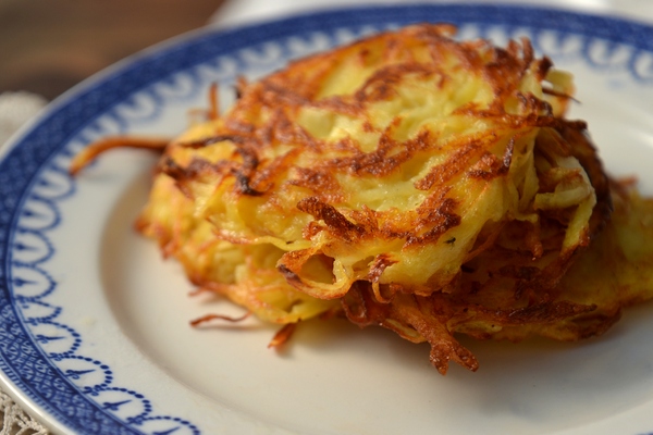 Очистить и натереть клубни картофеля. Лишнюю жидкость отжать. Очистить и натереть репчатый лук, смешать с картофелем, добавить сырые куриные яйца, пшеничную муку, соль и молотый перец. Хорошо перемешать. В большой сковороде разогреть масло, выкладывать оладьи столовой ложкой, жарить по две-три минуты с каждой стороны, до образования золотисто-коричневой корочки. Готовые драники-латкес выложить на бумажное полотенце, лишний жир должен впитаться.