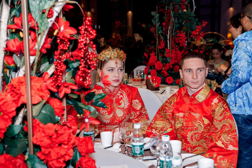 — Китайская брачная церемония проходила в новом здании, специально построенном для таких торжеств. По своему стилю оно напоминало Хогвартс — вымышленное учебное заведение волшебников из «Гарри Поттера», — продолжила Ксения. — Свадебный банкет длится от силы полтора-два часа. Гости рассаживаются, молодожены выходят на сцену, и тут начинаются обряды. На этот раз вместе с молодоженами из Хэйхэ все эти обряды проходили и амурские молодожены. Если у нас в России молодых посыпают пшеном на счастье, воруют невесту, то новобрачные Поднебесной рассказывают о своей любви при помощи веера и пластики. Омывают руки и повязывают нить на голову, чтобы прогнать злых духов. У гостей на столах лежит буклет, где расписаны каждый обряд и его обозначение. О том, что среди приглашенных будут русские, никто не знал, кроме китайских молодоженов. Поэтому гости с интересом рассматривали представителей другой расы в их нарядах. Но наша молодежь достойно вписалась в обряды и традиции другого берега Амура и стала изюминкой вечера. Да и самим ребятам очень понравилось. Каждый из них еще раз пережил моменты своей свадьбы.