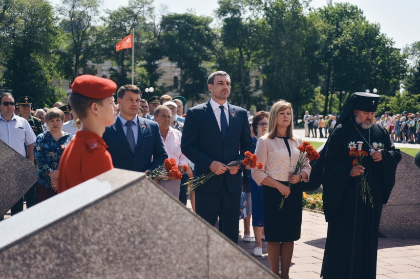 В 10 утра на площади прошел торжественный митинг и возложение венков и цветов к памятнику воинам-амурцам. В нем приняли участие врио губернатора Василий Орлов, председатель Заксобрания области Константин Дьяконов и мэр Благовещенска Валентина Калита.