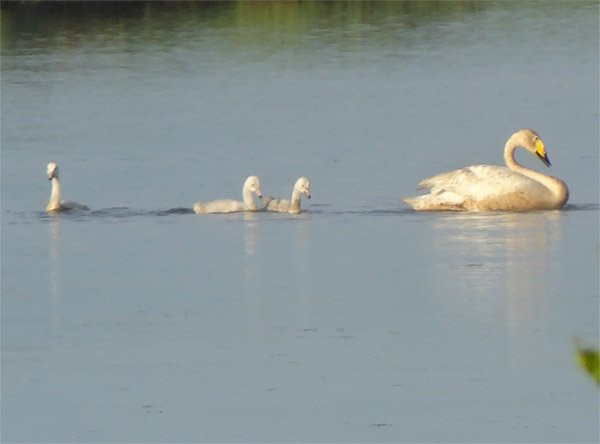 Однако в начале июня фотоловушка, установленная на грязевой отмели озера, зафиксировала эту же пару лебедей с пятью свежевылупившимися птенчиками. «Это значит, что они построили свое гнездо где-то совсем недалеко, так как таких маленьких лебедят далеко не уведешь, — уточнила научный сотрудник Марина Бабыкина. — С 21-го по 25 июня эта семья наблюдалась ежедневно, но уже с тремя подросшими птенцами».