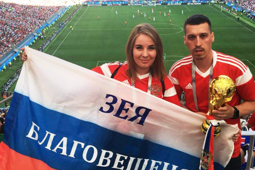 На стадион амурчане пришли с флагом России, на котором были написаны названия двух городов: Благовещенска, где родилась Ксюша, и Зеи — родины Славы. «Хотели сначала сделать надпись "Амурская область", но потом решили точечно отразить наши города, тем более что Зея не избалована такими приятными событиями», — поделился глава семьи. Помогала поддерживать сборную и копия кубка чемпионата мира по футболу. Ее ребята заказали на китайском сайте и везли с собой в Москву.