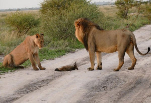 Эта история о льве и львице, которые заметили на дороге маленького лисенка. Он был слаб и у него не было никаких шансов убежать от пары грозных хищников.