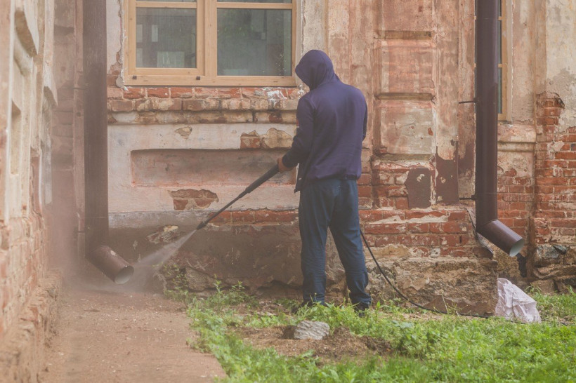 Для того чтобы не повредить старинную кладку, здание очищают от слоя штукатурки специальными деревянными дисками.