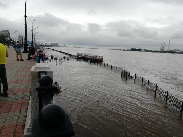 Неделю назад, 15 июля, уровень воды в Амуре в районе Благовещенска составлял 399 сантиметров, а в начале месяца — 290 сантиметров. Согласно прогнозу амурского Гидрометцентра, к концу неделю Амур в региональной столице может подняться до 700 сантиметров при норме в 510. Берегоукрепление современной набережной сдержит волну высотой до 950 сантиметров.