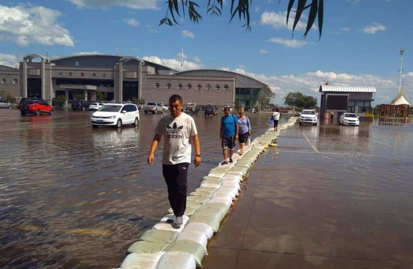 На пункте пропуска Хэйхэ туристы передвигаются по территории в ковше экскаватора. Как сообщалось ранее, из-за паводка на приграничном Амуре в воде оказались причал и площадь перед таможней.