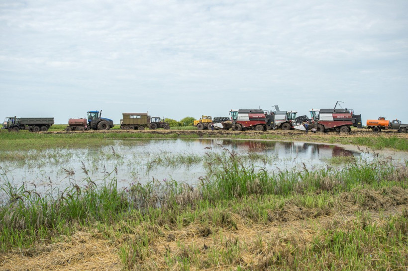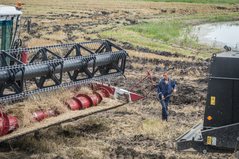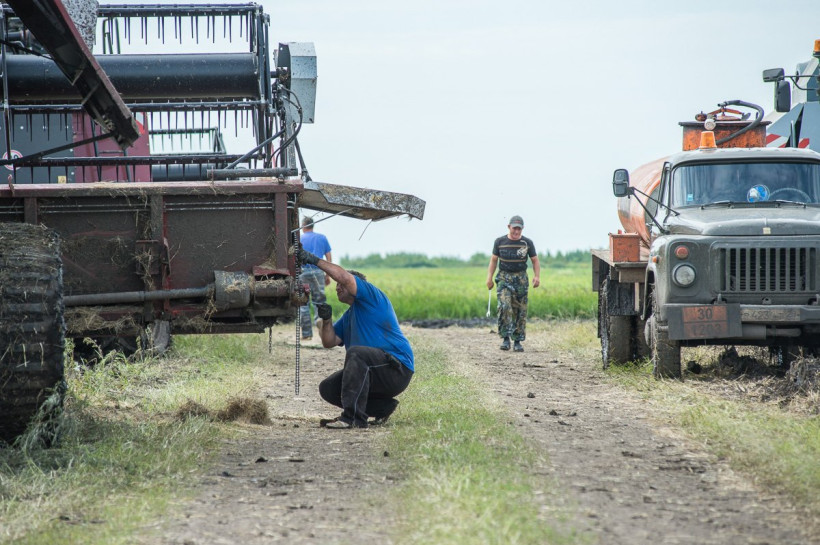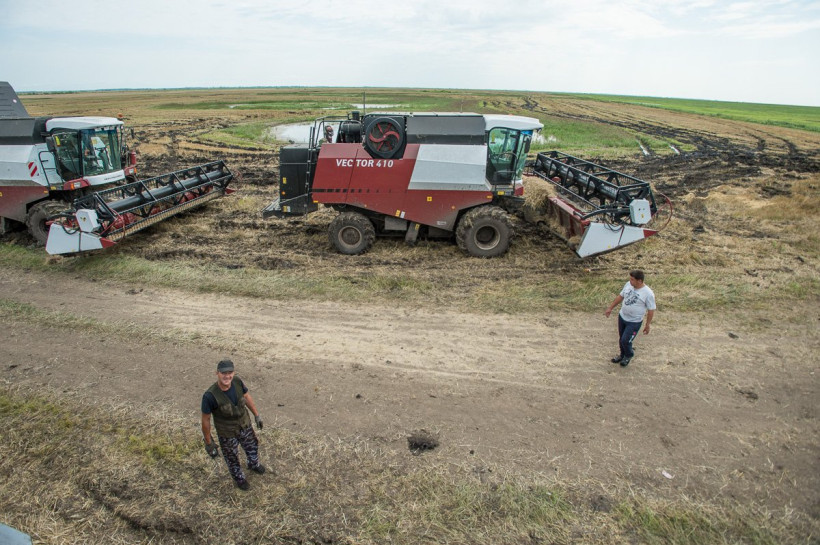 Вдоль полей дежурит трактор-тягач. То и дело комбайны увязают в грязи. 18-тонных гигантов вытаскивают на сушу.