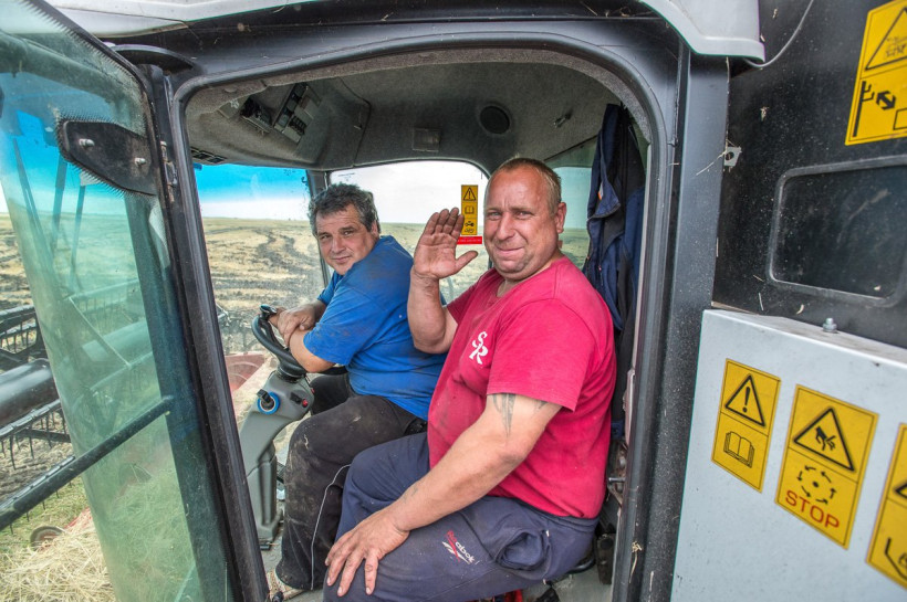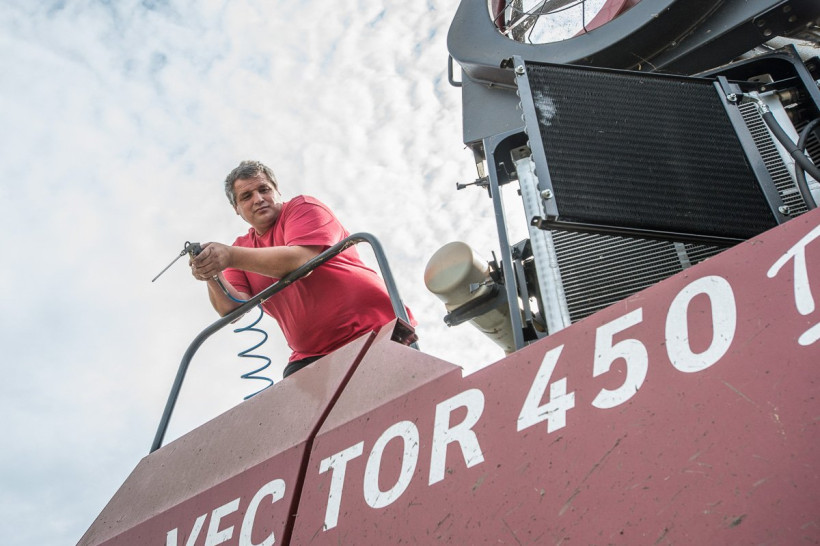 — Плывем, волну гоним. Резиновые сапоги в кабине стоят, — рассказывает механизатор Алексей Загороднюк, управляющий комбайном.