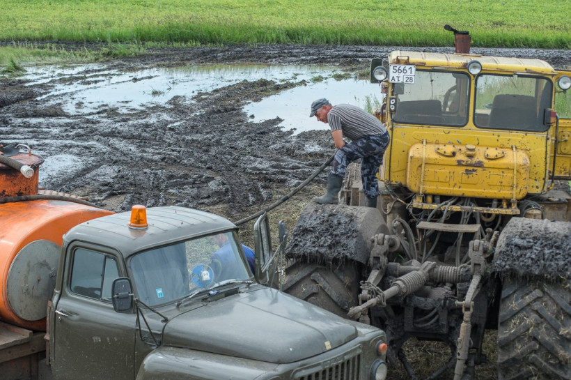 «Катастрофа!» — окидывает взглядом поля замгендиректора ООО «Амурское» Василий Овсеенко. В амурских хозяйствах позже срока стартовала уборочная кампания. Сами аграрии называют страду самой тяжелой за последнее десятилетие. Комбайны ходят по воде и грязи, в которые превратились угодья после продолжительных и нещадных дождей. Даже добираться к полям приходится по месиву — дороги размыты и разбиты. Уазик с корреспондентами «Амурской правды» тоже завяз в пути. На репортаж с подтопленных полей мы добрались с помощью тягача.