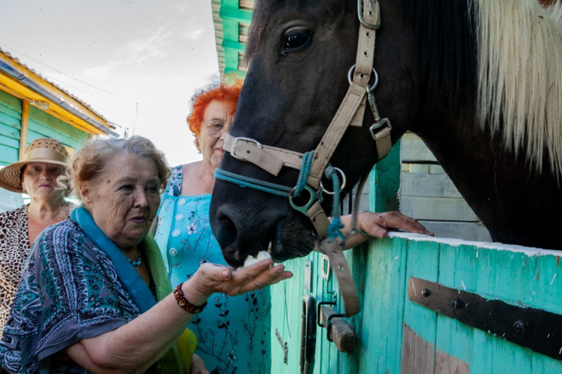 «Можно покормить лошадок?» — первым делом спросили благовещенские пенсионеры, приехавшие в гости в конноспортивный клуб «Аллюр». «Можно, только аккуратно — на ладошке лакомство подавайте», — посоветовали сотрудники клуба. Во вторник, 7 августа, 30 пожилых людей благодаря президентскому гранту погладили морды лошадям, заплели им гривы, а самые смелые даже сели в седло. После конной прогулки некоторые пенсионеры признались, что скинули сразу несколько лет.
