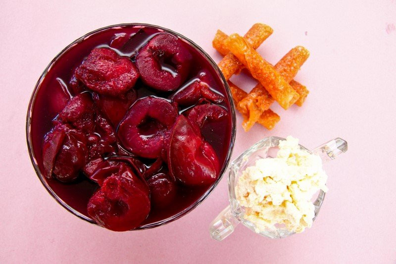 Сливы маринованные с чесноком, соус ткемали, творожные клецки и варенье без косточек