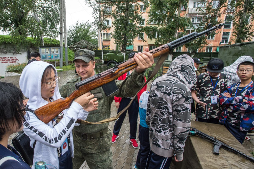 Ребятам из Поднебесной показали макеты пистолетов и автоматов, а также самый настоящий пулемет «Максим». Двенадцатилетний Артем Коновалов из военно-патриотического клуба «Россия» подробно рассказал о переносном пулемете Дегтярева и крупнокалиберном пулемете Симонова.