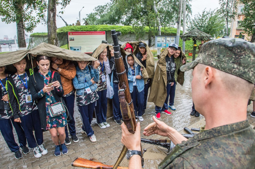 Как работает многозарядное ружье, почему лента пулемета «Максим» сделана из ткани, сколько можно продержаться в капонире без запасов воды из внешнего мира — обо всем этом во вторник, 20 августа, рассказали китайским школьникам, приехавшим на экскурсию в артиллерийский полукапонир в Благовещенске. Курсанты ДВОКУ провели ребят по узким коридорам оборонительного сооружения и показали, как могут жить солдаты в укреплении во время войны.
