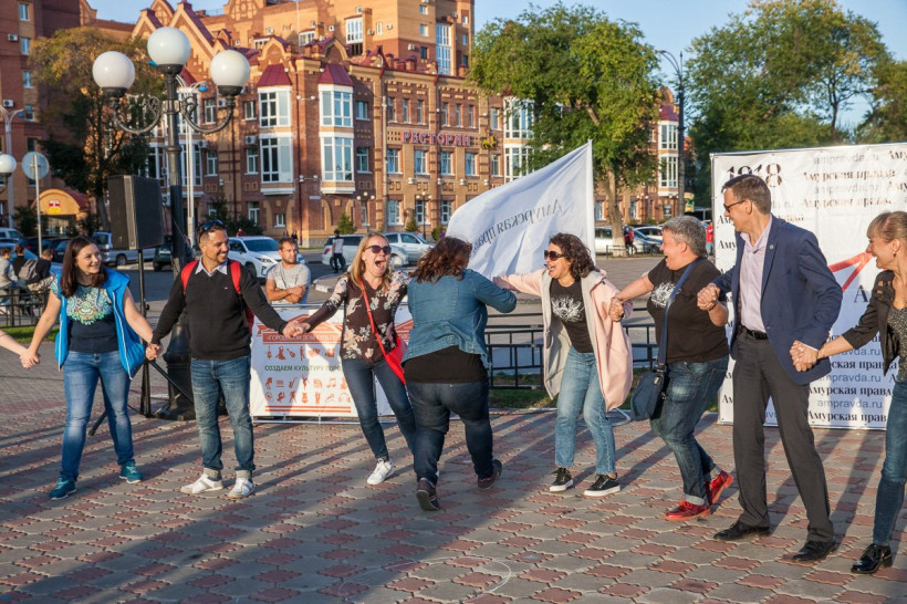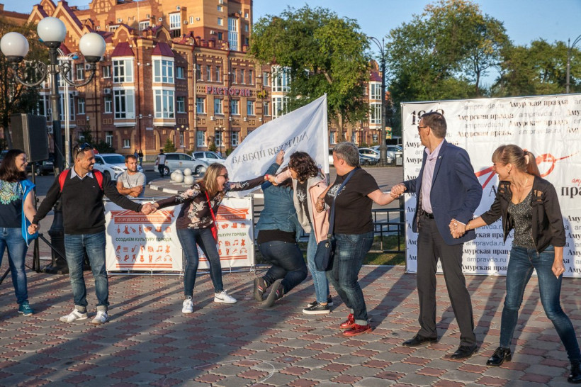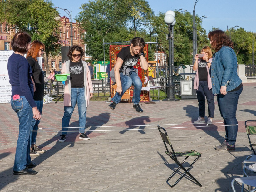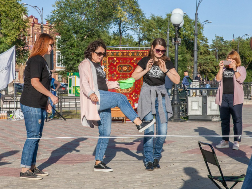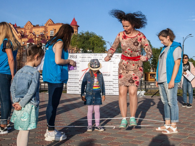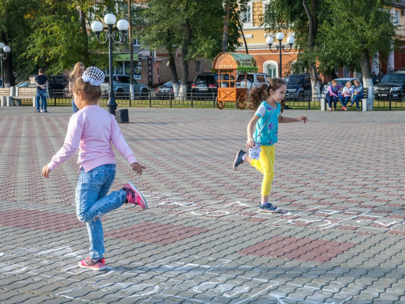 Скакалки, классики, резиночки, гигантские крестики-нолики, крепкие кандалы. Журналисты «Амурской правды» в минувшую пятницу впадали в детство со всеми желающими на набережной Амура. «Мы хотели научить современных детей играм, в которые в детстве играли их мамы и папы, — рассказали организаторы ретровечеринки. — И, судя по тому, с каким удовольствием ребятишки играли, у нас это удалось». Прямо на ретровечеринке можно было бесплатно отправить уникальную открытку в любую точку мира, поиграть в фанты и даже побывать в хрущевской квартире и сфотографироваться на фоне ковра.