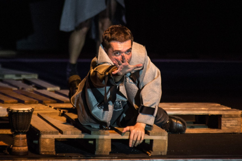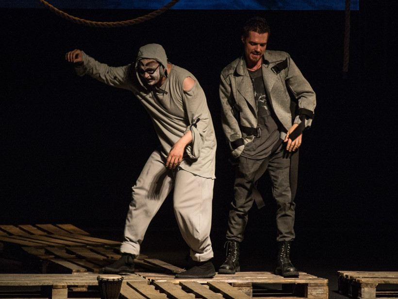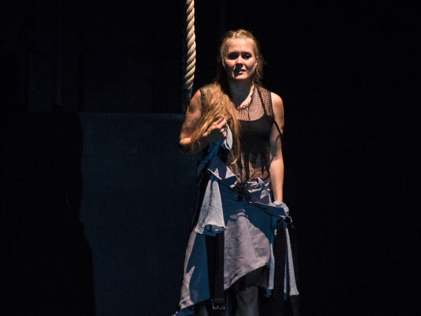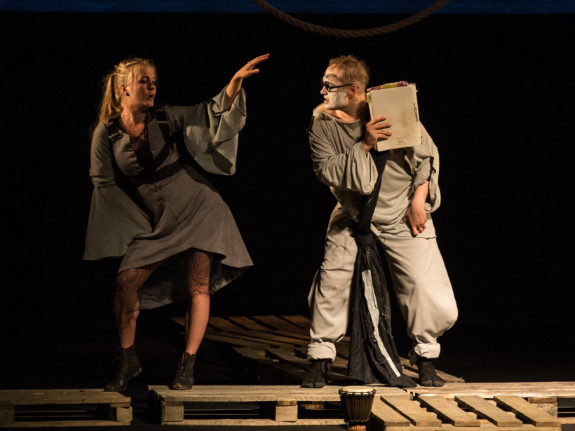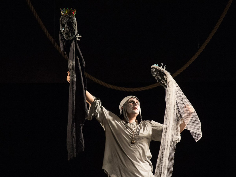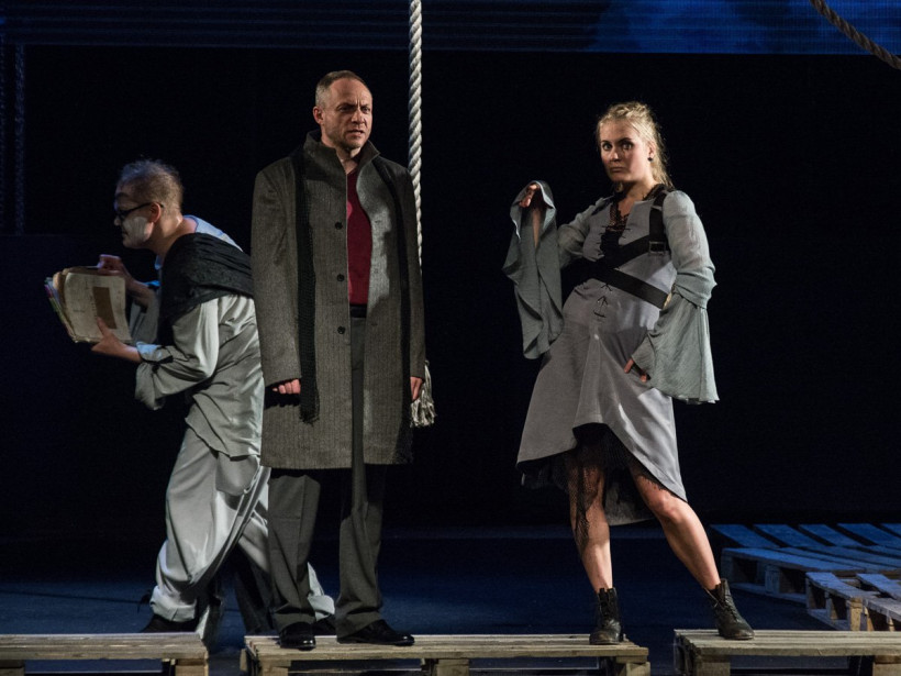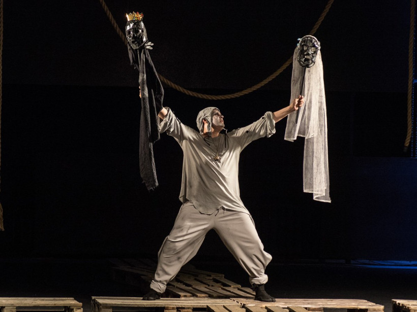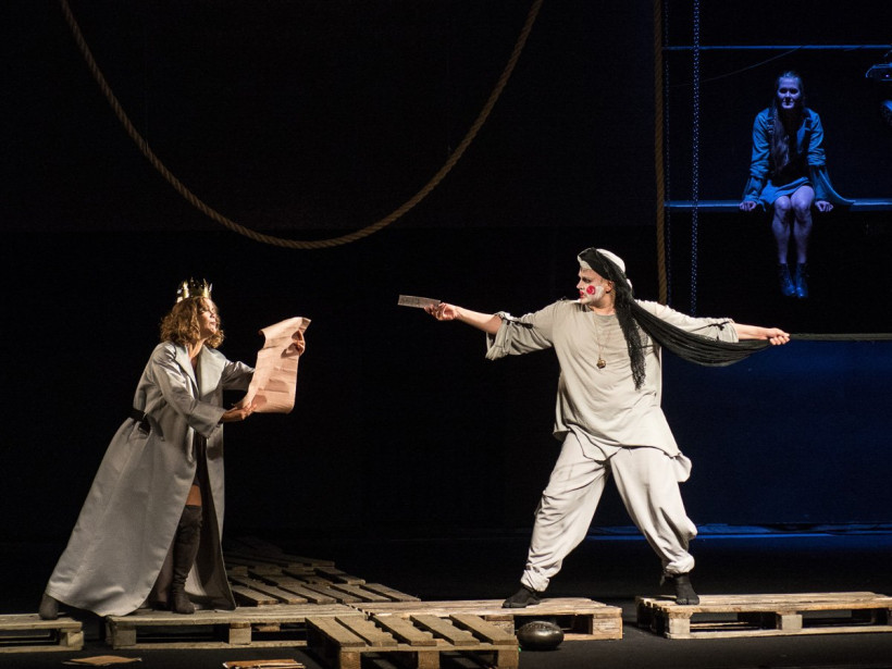 Серые одеяния, деревянный настил, канат и неяркий свет. Начинает представление шут. Он появляется на сцене еще до того момента, как все зрители заняли свои места. Заигрывает, шутит. Достает сценарий и распределяет роли. Он кукловод, дух. В исполнении Дамира Бахтиева герой становится едва ли не самым ярким во всей постановке.