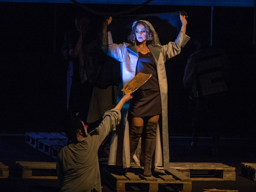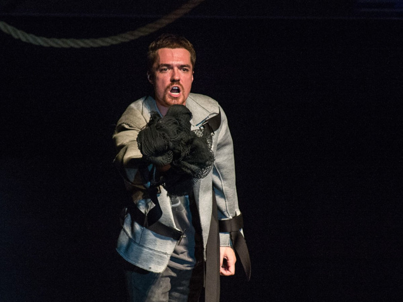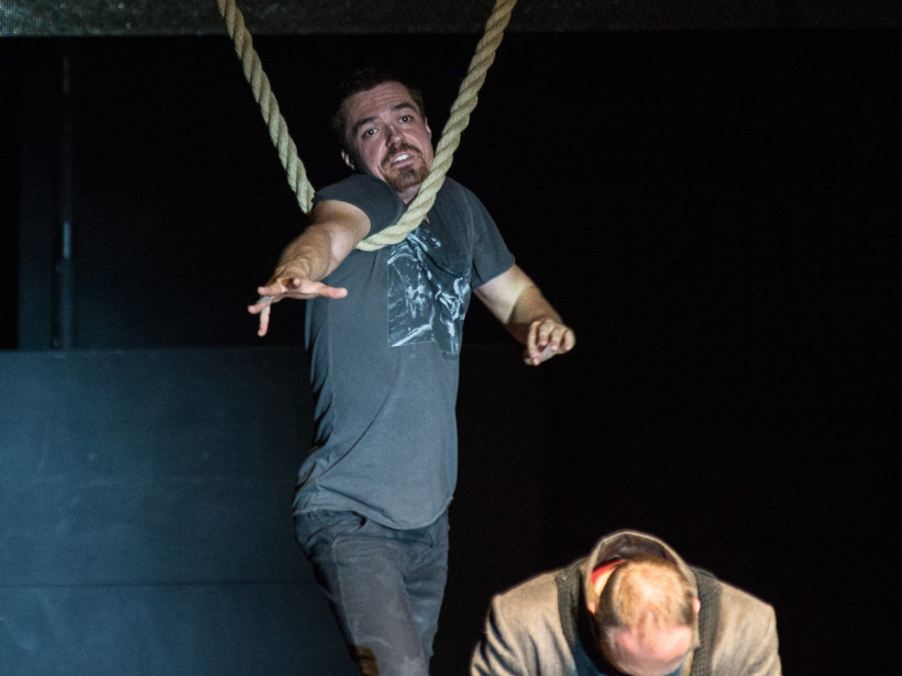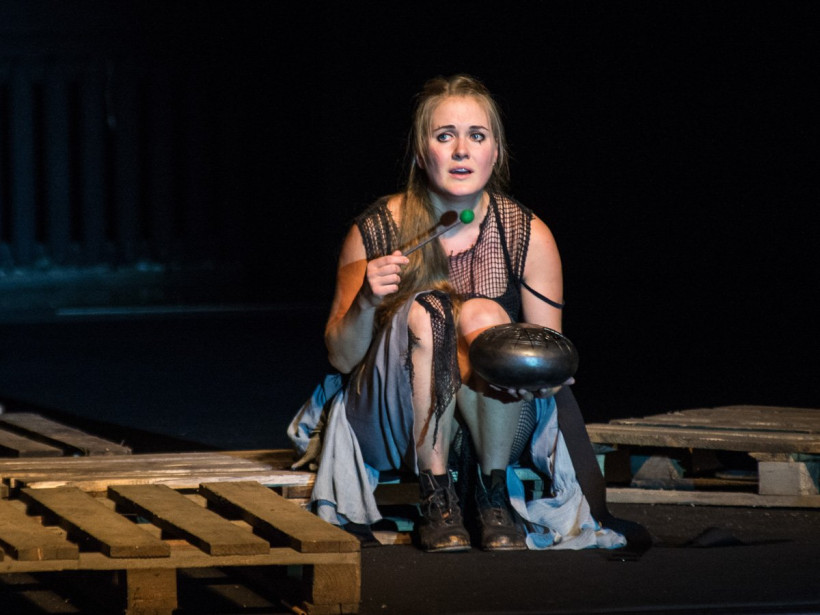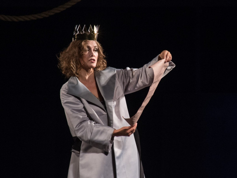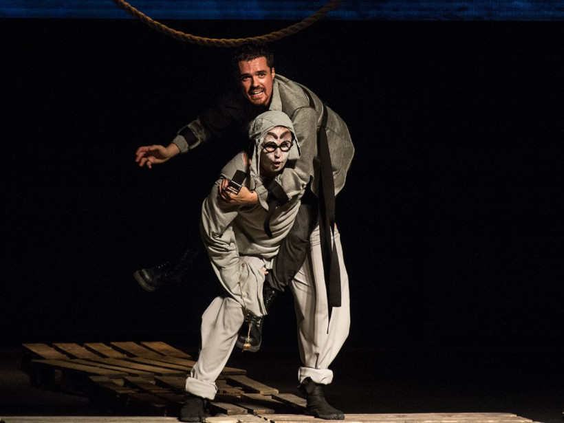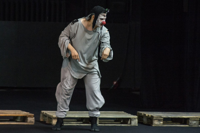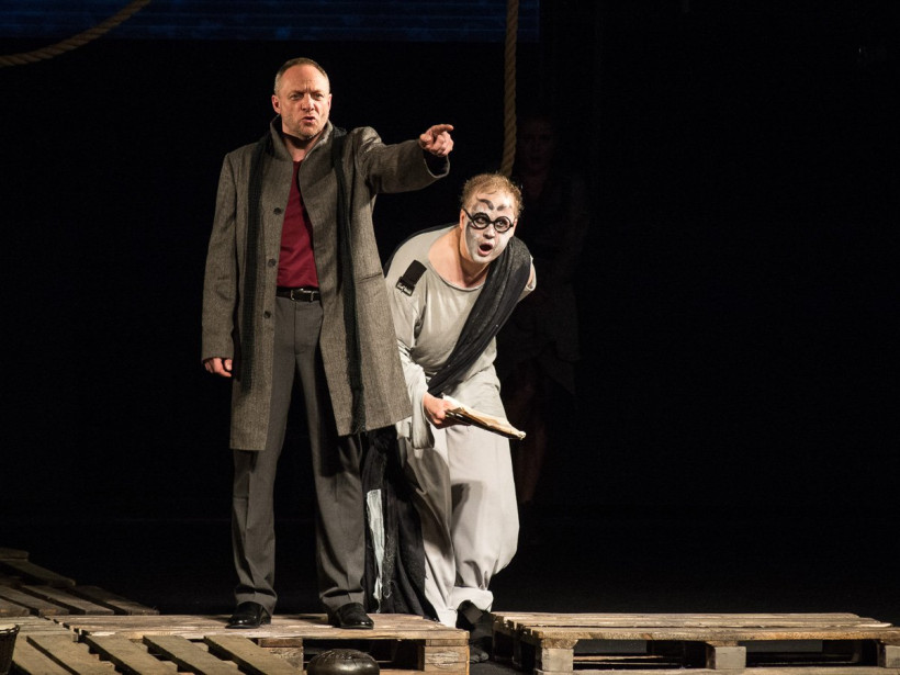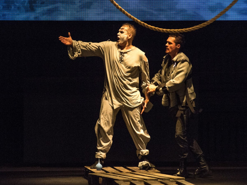 Серые одеяния, деревянный настил, канат и неяркий свет. Начинает представление шут. Он появляется на сцене еще до того момента, как все зрители заняли свои места. Заигрывает, шутит. Достает сценарий и распределяет роли. Он кукловод, дух. В исполнении Дамира Бахтиева герой становится едва ли не самым ярким во всей постановке.