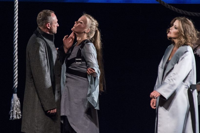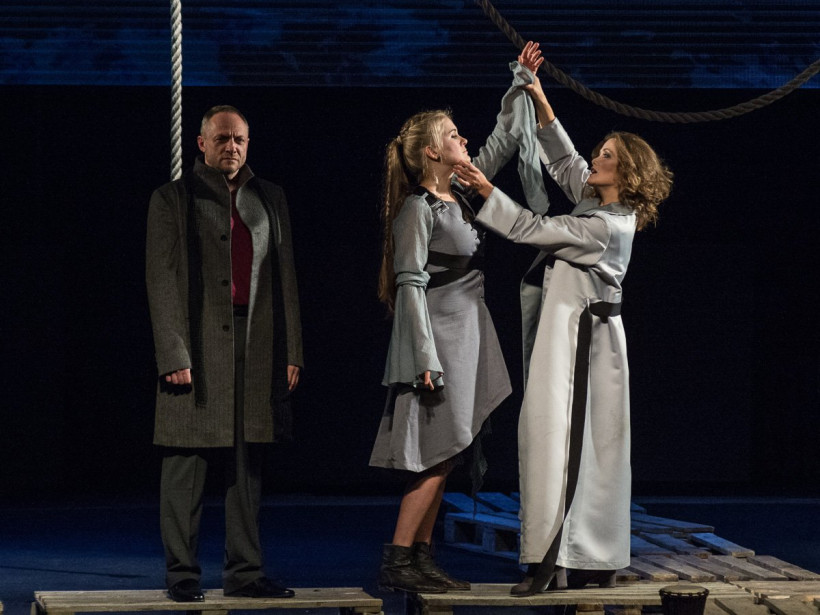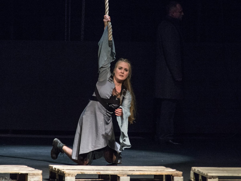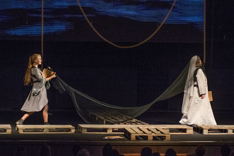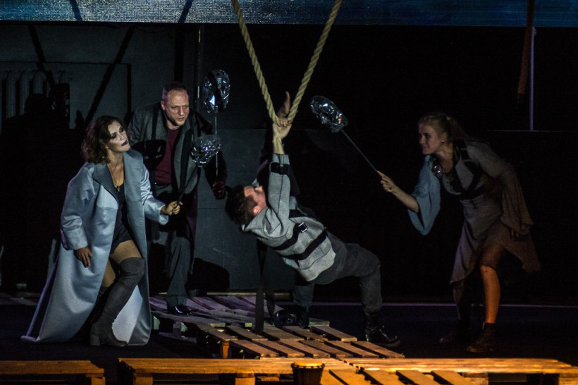 Декорации однообразные и неброские, но в контексте «нового Гамлета» это решение оправданно. Яркая деталь — канат, с которым то и дело взаимодействуют актеры, добавляет живость. Он символизирует жизнь: герои держатся за него, и канат не дает им упасть. Это источник силы.