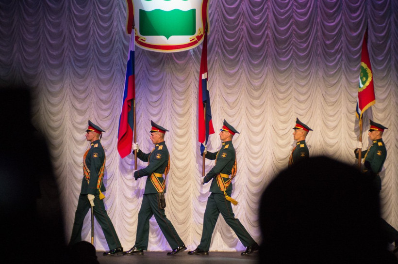 Церемония началась ровно в 13 часов — с выноса Государственный флага России, флага Амурской области и символов губернаторской власти — штандарта и должностного знака губернатора.