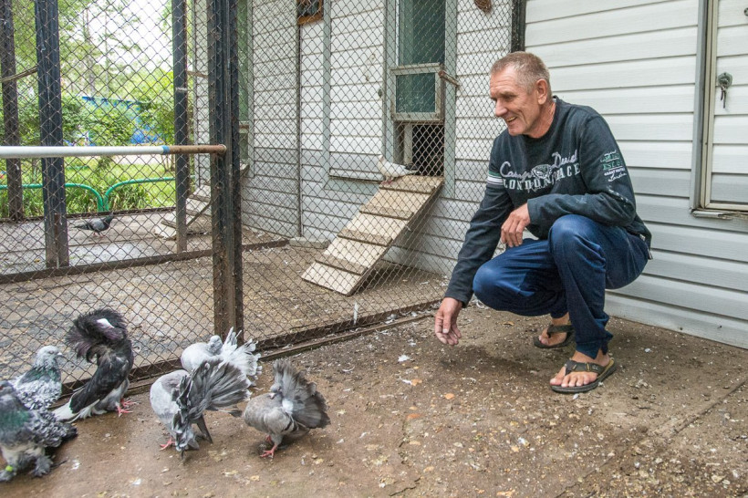 Тем более что сейчас любая финансовая помощь лишней не будет. Константин Фадеев всю жизнь проработал водителем-дальнобойщиком. Сейчас работы в городе нет, поэтому вынужден сидеть на пенсии — тяжелые рейсы отобрали почти все здоровье. Одна из отдушин — каждое утро навещать свое шумное голубиное хозяйство.