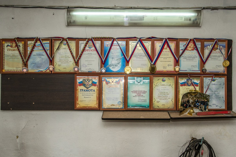 Одна из стен голубятни — в дипломах и наградах за разведение декоративных голубей.