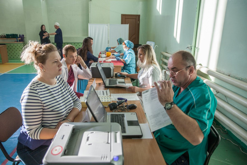 Еще одна важная часть подготовки к сдаче крови — осмотр доноров терапевтом. Важно, чтобы каждый участник акции чувствовал себя хорошо. Этим занимается начальник выездной бригады группы заготовки крови, врач-терапевт с тридцатилетним стажем Александр Сопот.