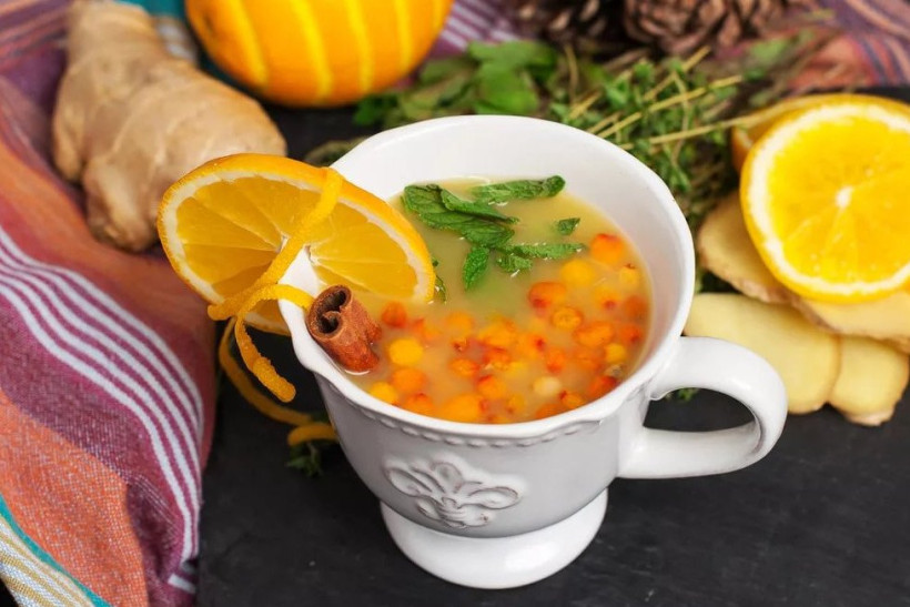 500 мл воды, 150 г ягод облепихи, 1 апельсин, 3—5 цветочков гвоздики, 2 щепотки корицы, 2 щепотки сухого имбиря, сахар или мед — по вкусу.