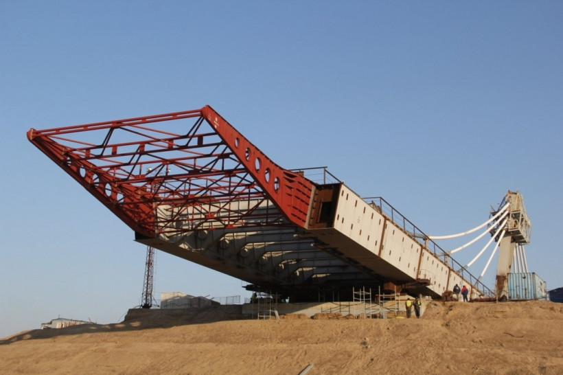 Строение движется вместе с пилонами со смонтированной вантовой системой без проектного натяжения до опоры № 6. Общий вес собранных металлоконструкций части пролетного строения, включая пилоны шестой опоры, составляет около 1 450 тонн.