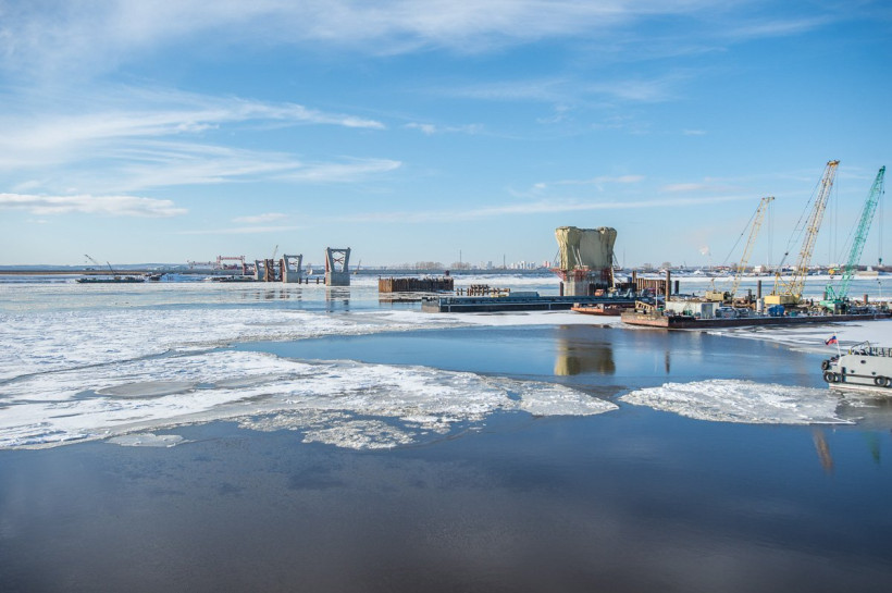 После того как на опоре устанавливаются пилоны, к которым крепятся тросы вантов, начинается надвижка. Сейчас строители продолжают закреплять первое пролетное строение на трех опорах. Одновременно идет установка пилонов на следующей опоре и сборка второй части пролетного строения. До конца января предстоит сварить следующие 147 метров.