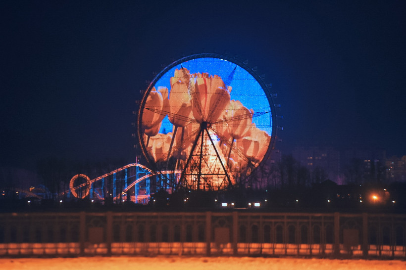 Необычная подсветка украсила 82-метровое чертовое колесо в городе Хэйхэ, которое видно с благовещенского берега реки Амур. Огромные желтые тюльпаны светятся в темное время суток. Фотография с российского берега размещена в «Инстаграме» амурского Центра поддержки экспорта.