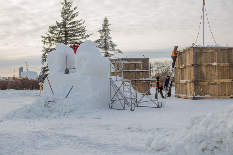 На центральной площади Благовещенска полным ходом идет строительство снежного городка. Здесь начали делать каток, параллельно возводят снежные фигуры, уже заложены первые горки и ограждение. На днях в администрации города выбрали эскизы фигур для городка – свои идеи предлагали жители Благовещенска.