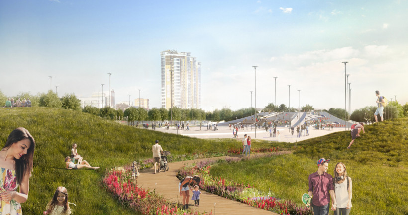 Холмы внесут разнообразие в рельеф набережной, а их покрытие будет разнородным: часть — это мощение, часть — газон. На холмах расположена детская площадка с горками, ступеньками и качелями. Гуляя между холмов, люди будут видеть город и набережную каждый раз по-разному, а дети веселиться, взбираясь на холмы и скатываясь с них.