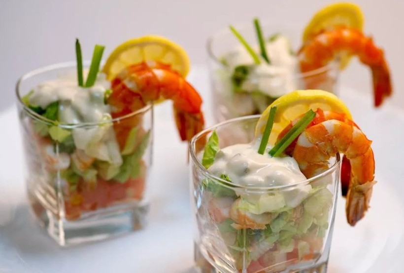 Салат на фуршетный стол подают в маленьких рюмочках. Приготовьте их заранее, укройте пленкой, а в нужный момент просто достаньте из холодильника. Салат-коктейль с креветками относится к шикарным и всегда уместным праздничным закускам. Он придаст изысканности любому меню. Разморозьте креветки и отварите 3—4 минуты в подсоленной воде, затем очистите. Или используйте готовые из баночки. Тоненькой соломкой нарежьте огурцы, сыр и яблоки, авокадо — кубиками (яблоки и авокадо нужно сбрызнуть соком лимона, чтобы они не потемнели). Разложите салат по рюмочкам, сверху положите креветки, посолите, поперчите и заправьте капелькой майонеза.