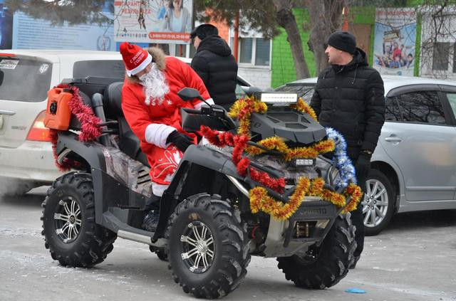 Деды Морозы на квадроцикле открыли снежный городок в Белогорске
