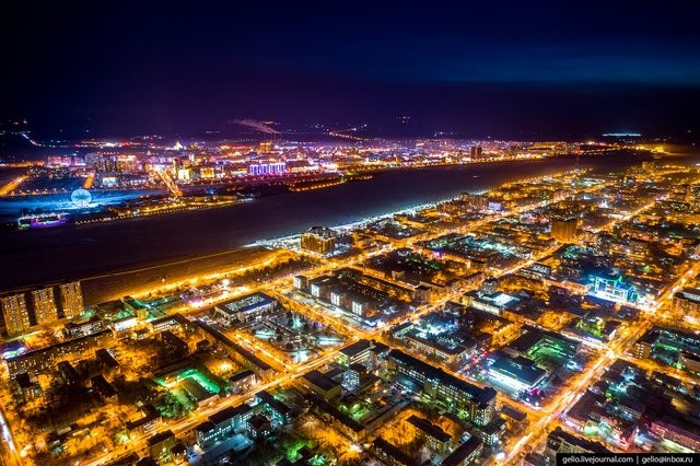 Фотоснимки Благовещенска во всей его красе Слава опубликовал в своем «Инстаграме» во вторник, 5 февраля. Город снят с высоты птичьего полета в дневное и темное время суток. Обычно для съемки Слава забирается на крыши высоток или привлекает вертолет.