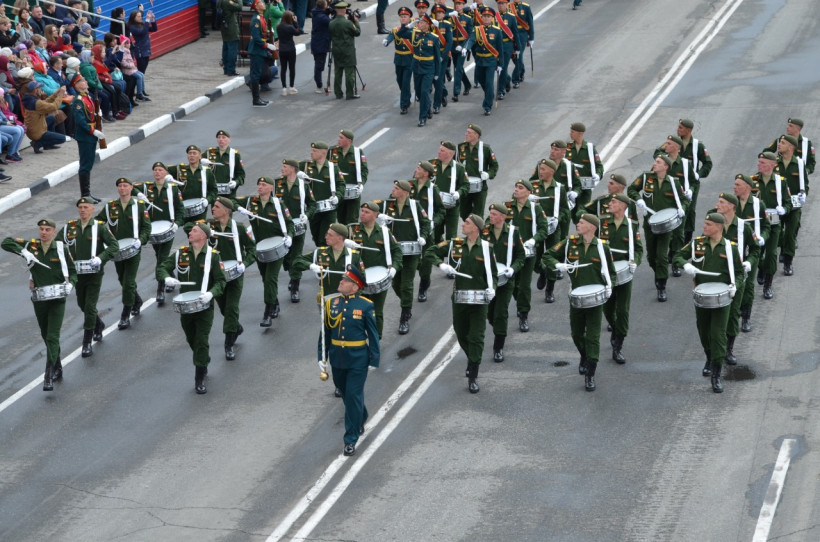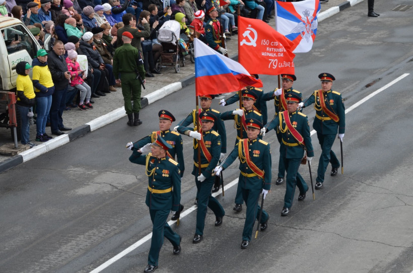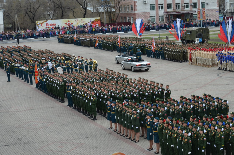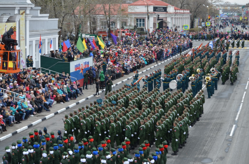 В параде Победы принимали участие 1,3 тысячи военнослужащих личного состава 35-й Армии, а также 27 единиц техники. В том числе огнеметные системы «Солнцепек», поступившие на вооружение в 2018 году. Также по улице Кирова прошли бронетранспортеры, гусеничные боевые машины пехоты, танки, самоходные гаубицы «Акация», армейские самоходные пушки «Гиацинт», реактивные системы залпового огня «Ураган» и самоходные противотанковые ракетные комплексы «Конкурс».