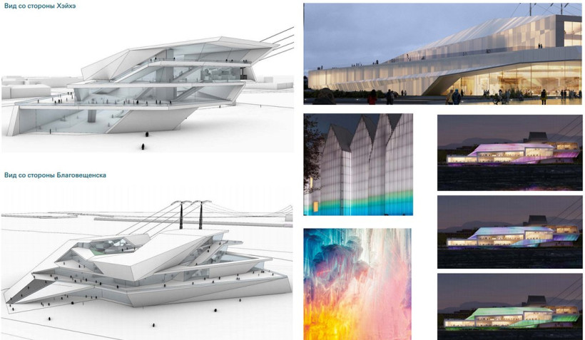 Однако самым интересным объектом станет не сама дорога, а четырехэтажная терминальная станция. По проекту фасад станции будет выполнен из двухслойной светопропускающей оболочки. Из больших окон открывается вид на Благовещенск, Хэйхэ и окрестности. Вечером уникальное сооружение будет видно с противоположного берега Амура — за счет цветной подсветки, которая будет постоянно меняться.
