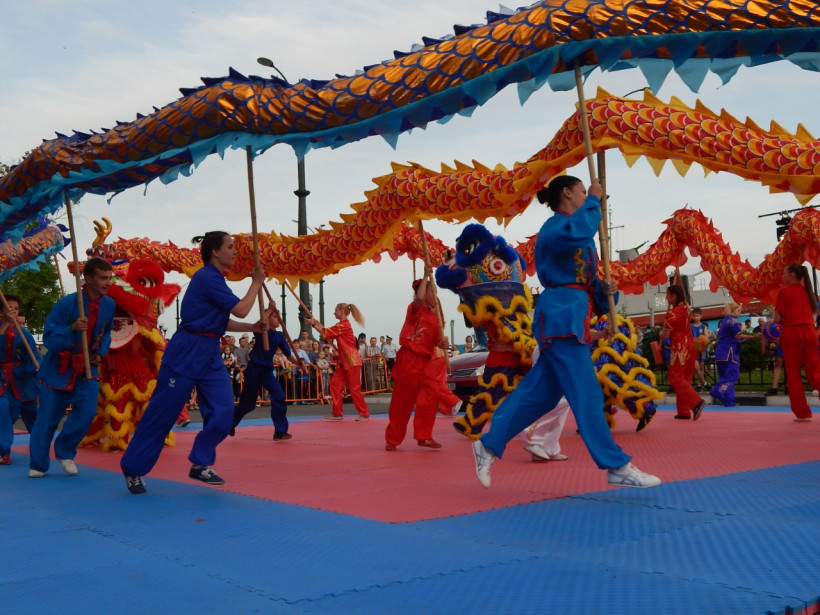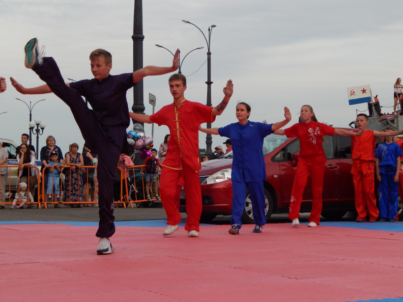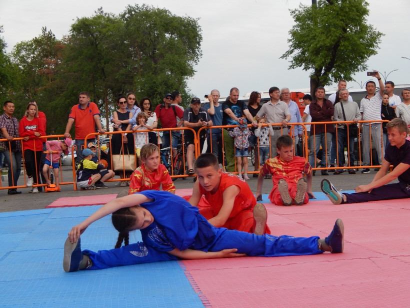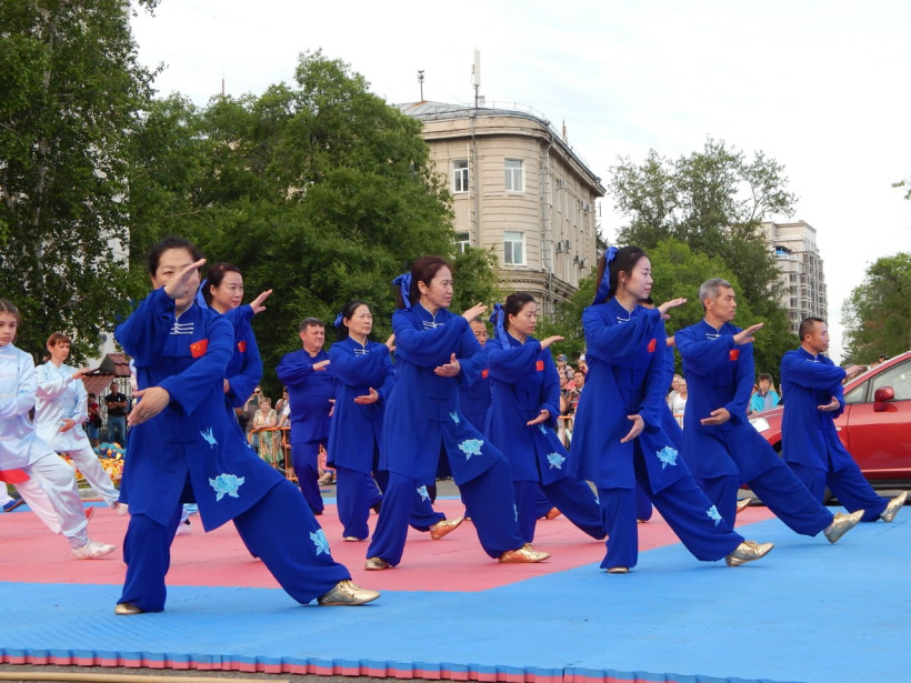 70 амурских и китайских спортсменов показали на набережной Благовещенска ушу и приемы борьбы