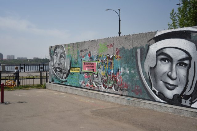 Граффити-стена была установлена в 2014 году. Она доступна для всех желающих, единственное, рисунок нужно согласовать с администрацией города. Самое первое изображение в желто-красных тонах через длительное время были заменены на портреты космонавтов Юрия Гагарина и Валентины Терешковой. В 2018 году их закрасили художники Антон и Антонина Черноок, анонсировав свою выставку. После арт-объект демонтировали, так как он со временем обветшал.