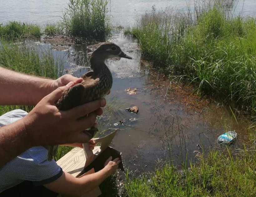 Служащие управления по охране животного мира поймали пернатое семейство сачком и выпустили в районе Чигиринского водохранилища