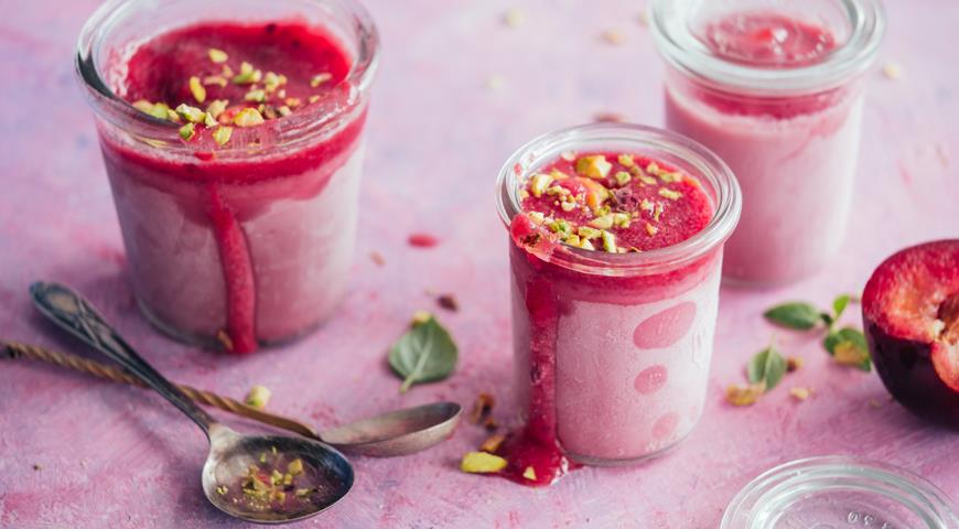 В ступке разотрите семена кардамона с сахаром и лимонной цедрой. Сливы разрежьте пополам и переложите в кастрюлю. Добавьте в смесь кардамона с сахаром 90 мл воды. Залейте сливы и доведите до кипения на среднем огне. Уменьшите огонь, накройте крышкой и варите 10 минут. Откиньте сливы на сито, переложите в чашу блендера и измельчите в пюре. Полностью остудите. Смешайте в чаше блендера до однородности сгущенное и концентрированное молоко и 300 г сливового пюре. Разлейте по 6 небольшим формочкам и уберите в морозильник на 4 часа. Окуните формочки в горячую воду и подержите несколько секунд. Переверните и выложите мороженое на тарелку. Подайте с оставшимся пюре и фисташками.