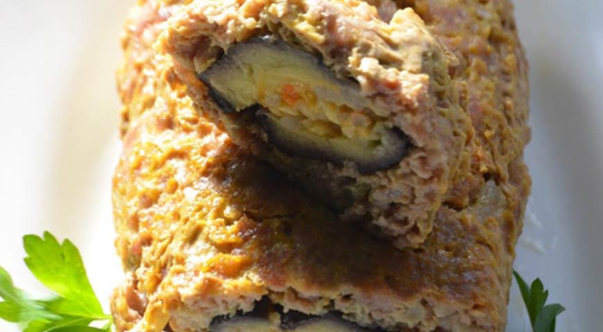 Куриный фарш равномерно распределить руками по пищевой пленке. Положить на фарш баклажан и аккуратно «укутать» фаршем, соединяя края пленки. Пленку снять. Баклажан переложить в форму для запекания. Предварительно эту форму смазать растительным маслом. Придать форму баклажана фаршу, сбрызнуть слегка растительным маслом. И запекать в духовке при температуре 180-190С до румяного цвета. При подаче нарезать на кусочки.