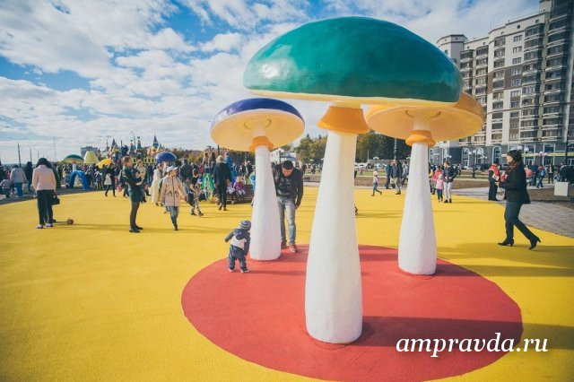 Детский игровой городок на новом участке городской набережной появился в октябре 2017 года благодаря участию в федеральной программе «Формирование современной городской среды». Войдя в нее, Благовещенск получил финансовую помощь в размере 139 миллионов рублей. Около половины этой суммы на основании мнения горожан и было направлено на благоустройство общественной территории на набережной.
