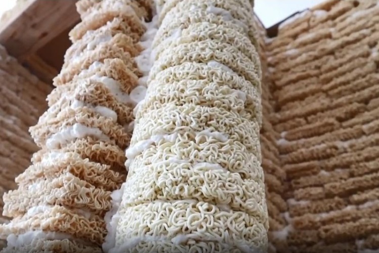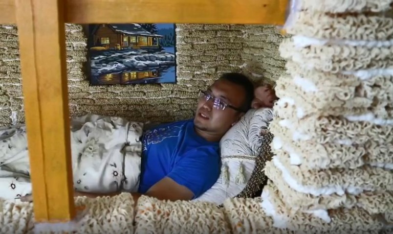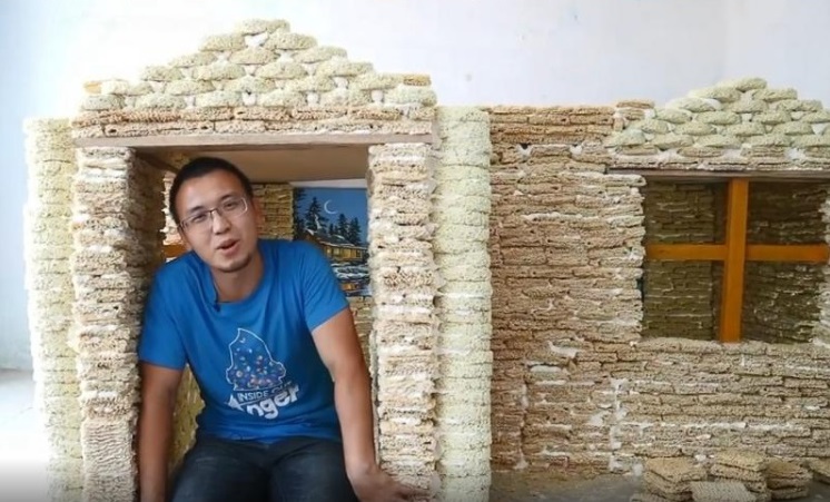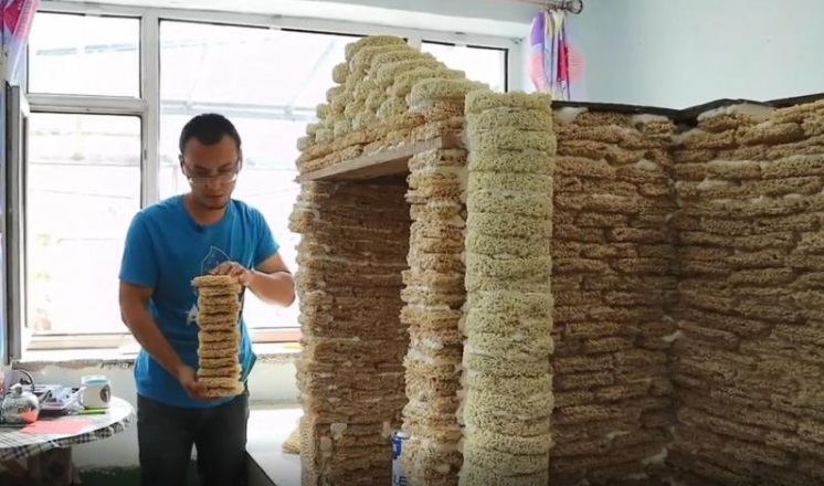 Мужчина по имени Чжан из китайской провинции Цзилинь очень любит лапшу быстрого приготовления и часто покупает её у своего друга, занимающегося оптовой торговлей. Однажды приятель пожаловался Чжану, что не смог продать около 2000 упаковок лапши, и срок её годности истёк. Просроченной еде надо было бы отправиться на помойку, но Чжан взял все упаковки себе — дело в том, что в ближайшем будущем мужчина станет отцом маленького сына, так что он решил использовать прессованную лапшу для необычного строительства. Будущий папа потратил четыре дня, возводя из съедобных кирпичей, скреплённых клеем, домик для своего отпрыска.