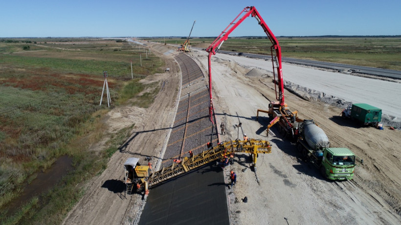— Процесс заключается в распределении бетона бетононасосом, после этого вращающимся вальцом мы производим затирку, уплотнение и финишную обработку самого бетона. За смену такая машина способна делать до тысячи квадратных метров бетонного покрытия, — рассказал прораб на участке бетонирования откосов Александр Меньшиков.