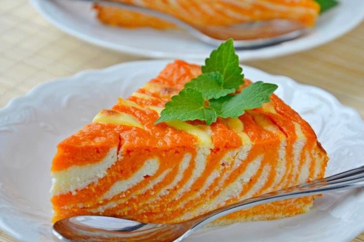 В одну посуду сложите творог, яйца, кефир, разрыхлитель и сахар. Взбейте миксером до однородности. Не любите крупинки творога — пропустите его через сито, а потом смешивайте с остальными ингредиентами. В чаше блендера превратите в пюре вареную тыкву с медом, манкой и корицей (этот ингредиент по желанию). Нет блендера — воспользуйтесь мясорубкой или просто подавите тыкву вилкой. Чашу мультиварки смажьте сливочным маслом, порциями выложите в центр дна чаши творожную и тыквенную массу, по очереди (как в известной «зебре» — две ложки одной, две ложки другой, и так до конца). Готовьте запеканку на программе «Выпечка» 50 минут. Дайте остыть, потом доставайте.