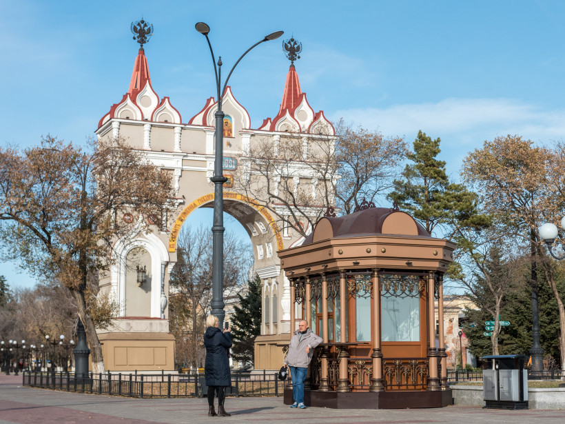 Новый объект появился на набережной Амура в Благовещенске. Пространство украсил кованый киоск. Он стоит в районе Триумфальной арки. В киоске продаются изделия местных мастеров.